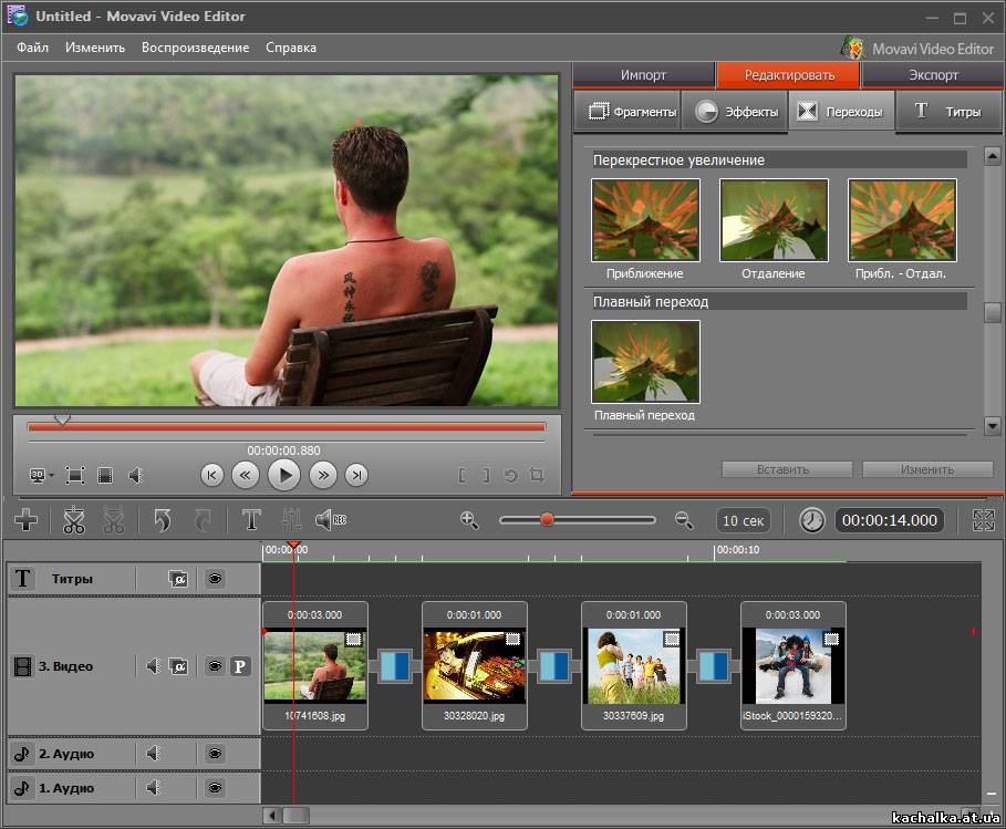 § Добавляйте видеопереходы и эффект угасания для аудиотреков. Записывайте аудио непосредственно в редакторе.
